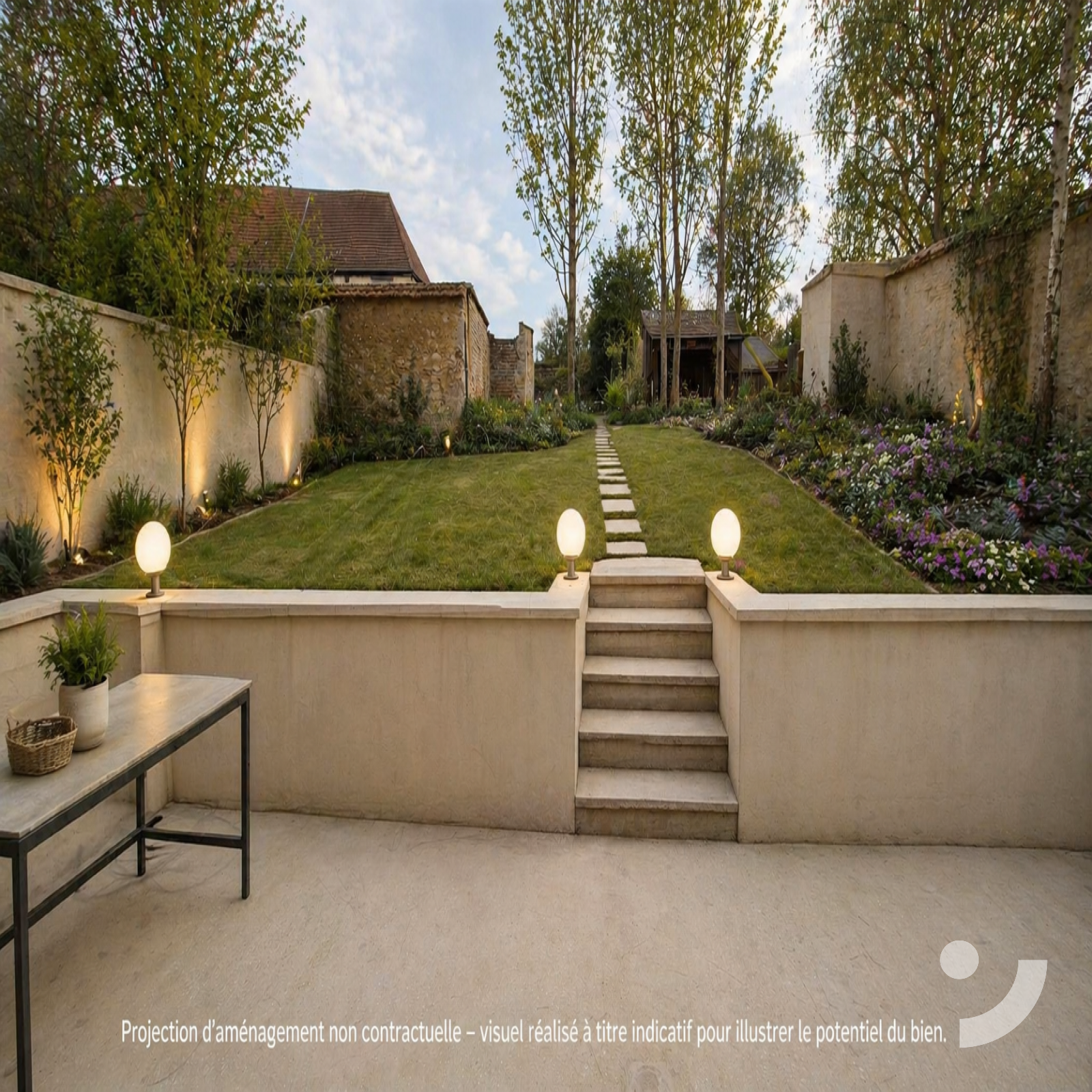 jardin d’environ 540 m², terrasse, garage, cave, combles aménageables d’environ 100 m² au sol, offrant un fort potentiel d’agrandissement ou d’aménagement complémentaire.
